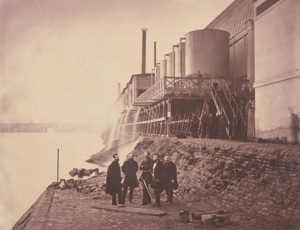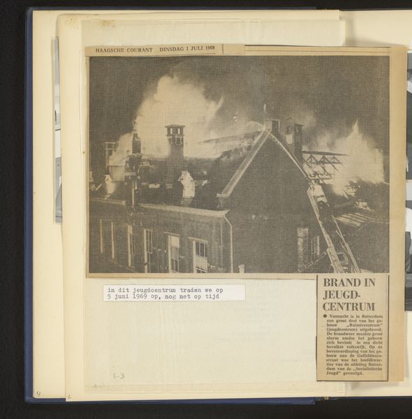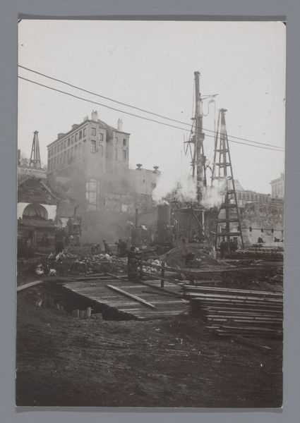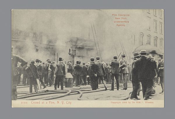 Curator: Woah, that is… intense. It feels like standing right at the edge of chaos, all grit and smoke. Makes you cough just looking at it. Editor: You're right, the atmosphere is thick! This image, created around 1905 by De Witt C. Wheeler, is a promotional advertisement for the Fire Insurance New York Underwriters Agency. It's a gelatin silver print capturing firefighters battling a blaze, titled, rather dramatically, “Fighting the Flames.” Curator: Well, dramatically and effectively! I mean, what better way to showcase the need for fire insurance than to put a roaring inferno right in front of people? And the way the light catches the water…it’s beautiful, almost balletic, against all that destruction. There's a strange grace in the chaos. Editor: Precisely. Beyond the immediate drama, it highlights early 20th-century urban anxieties. Fires were a very real threat, and this image played into that, while of course offering a solution: insurance. It reflects how companies used imagery to shape public perception and capitalize on those fears. Look at the sheer volume of pipes lying about! Curator: Right? Like industrial pythons all vying for water's life-giving flow. It speaks to a world undergoing huge, clunky changes, doesn't it? All that heavy machinery versus the fragility of what...wood and brick buildings? It's kind of prophetic, even. And I see the touches of art nouveau! Editor: It absolutely does speak to the changing landscape. And it's an intriguing example of street photography employed for explicitly commercial ends. We often see street photography documenting social issues, but here it’s being leveraged to sell peace of mind. What this gelatin print medium offered was great fidelity with affordable printing and distribution to a wide demographic, giving it social reach and significance. Curator: I am oddly moved by this piece—moved by that fight against inevitable destruction. I also get a sense of community, and working toward something. The adrenaline must have been incredible. So it's not *just* insurance; it's that, together, maybe we have some agency over disaster. Or at least we can hose it down pretty effectively! Editor: A poignant reflection. It seems Wheeler's image managed to tap into both our fears and our hopes. Even now it offers a view into how anxieties about urban safety could be packaged and sold—making us ponder how much the art of marketing has truly evolved.