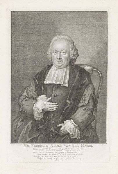 Curator: This is James Thomson's portrait of John Wesley, an important figure in the Methodist movement. It resides here at the Harvard Art Museums. Editor: There's a formality to the print that reminds me of engraved bank notes, but less about money and more about the weight of belief. I am interested in the paper stock that was used. Curator: Indeed, Wesley was a powerful orator, known for his persuasive preaching that sparked great social change. Editor: Looking at the way his hand hovers over the book, you can practically feel the crispness of the paper, the ink pressed into the page, the hours of labor spent to create such an image. What does the text say below the portrait? Curator: The inscription celebrates Wesley's role as a gifted teacher and founder of Methodism, capturing his lasting legacy on religious and social thought. Editor: Considering how widely such images were disseminated, it speaks volumes about the consumption and material culture surrounding religious figures at the time. Curator: A potent reminder of the visual strategies employed to disseminate faith and social ideologies. Editor: It's a testament to the power of printed imagery in shaping public perception and solidifying religious authority.