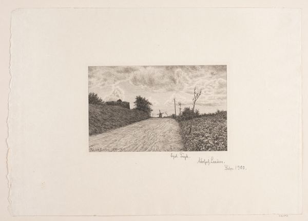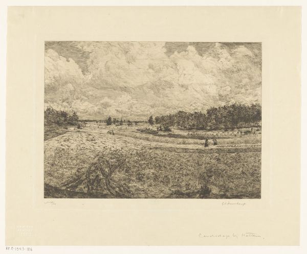 Richard Lorenz created this print called ‘Voorjaar,’ the Dutch word for Spring, likely in the late 19th or early 20th century. During this period, there was growing artistic interest in rural life and landscapes across Europe. This etching offers a glimpse into the agrarian world, but also touches on class and labor. The workers in the fields, their figures small against the vastness of the land, remind us of the hierarchies inherent in agricultural life. The unease one might feel viewing this landscape is heightened by the somber, almost monochromatic palette. It’s as if the artist asks us to consider not just the beauty of the countryside, but also the social realities embedded within it. While the artwork doesn’t explicitly challenge traditional representations, it subtly introduces alternative narratives by prompting viewers to question the lived experiences behind seemingly idyllic scenes.