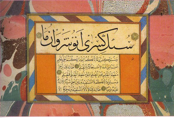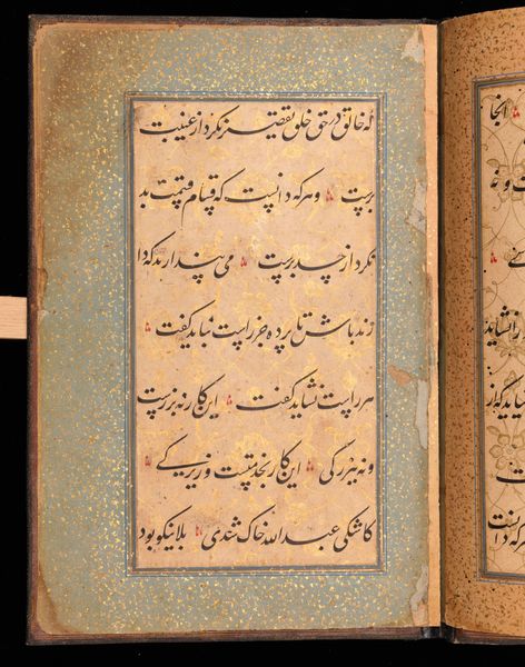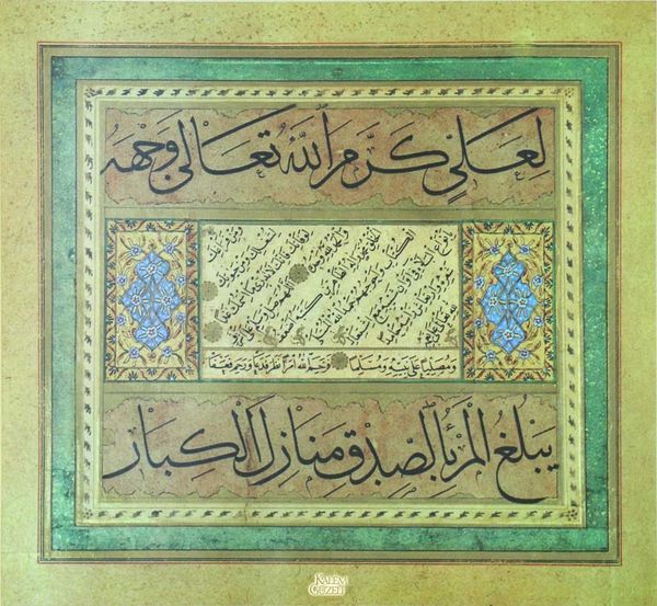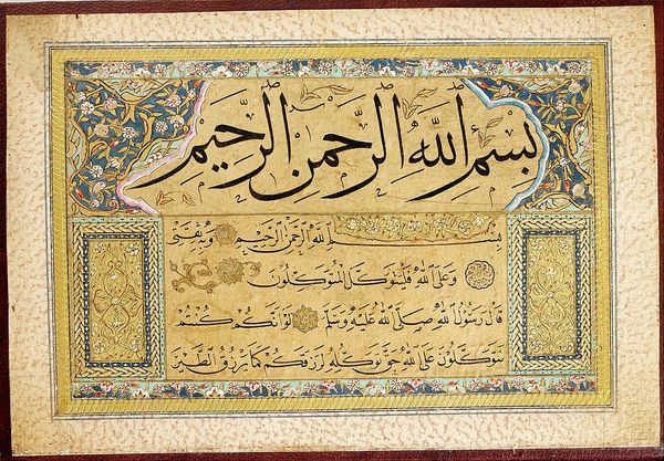 Curator: What strikes you first about this untitled piece by Sheikh Hamdullah? Editor: The marbling. It overwhelms me; the swirling patterns bleed into the structured text, as if order is constantly undermined. What materials were involved here, do we know? Curator: It seems the artist used watercolors on paper—perhaps toned or tea-stained. I notice it is not just the background marbling technique you describe but also what seems to be tile and textile design influence within the frame of the calligraphy. A visual layering of patterns! Editor: Interesting. The tea-staining particularly intrigues me. That's not just aesthetics, that’s altering the material, almost aging it before time. Was that a common practice then, a means to cheaply antique works for increased social value? And look at the watercolour bleed—the making seems imprecise but clearly skilled. Curator: Possibly. In terms of symbolism, calligraphy holds immense weight in Islamic art; the careful script a direct representation of sacred text. And I am struck that the paper itself mimics swirling chaos, echoing both the beauty and ephemerality of life. What text does it frame here? I see Arabic letters, though I can not tell what passage. Editor: Exactly! The materiality is intrinsic to the symbolism. Imagine the expense of inks, the artisan labor, the preparation of the paper! How that reflects back on the power and sanctity invested in the word. Is there any indication of what workshops or guilds were connected to Sheikh Hamdullah? Curator: Sadly, our information about production circumstances here is limited, though scholars continue piecing together the historical context. For me, it evokes something profound—a kind of serene contemplation born from apparent chaos, bridging the divine word with the everyday materials it’s rendered on. Editor: I come back to the aging and layering—palimpsests layered over palimpsests. As though it is actively decaying but enduring even as it does. Curator: I agree, the artwork definitely captures my interest, how the materials of our tangible world give voice to what remains so essentially intangible. Editor: Indeed. For me, this speaks of time, labor, value – the unseen hands that breathe significance into every created piece.
