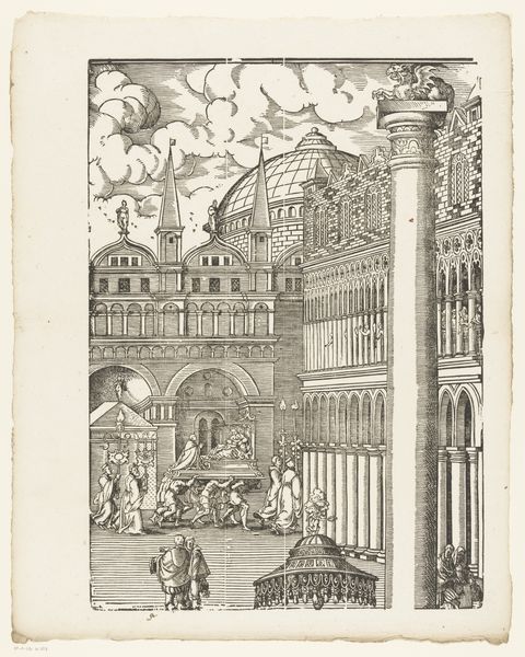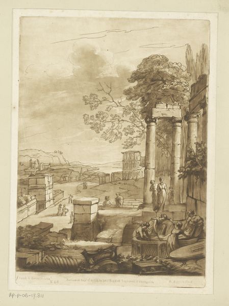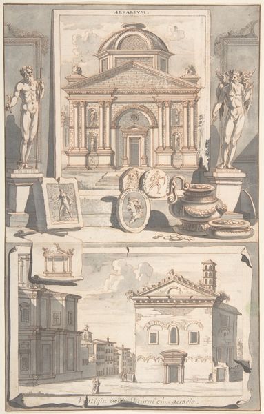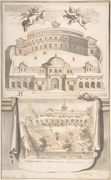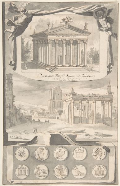 Editor: Here we have Jan Goeree’s "A Reconstruction of the Mausoleum of Augustus (above) and a View of the Ruins (below)," created between 1690 and 1704. It’s an engraving, contrasting an ideal past with a crumbling present. What visual elements strike you most? Curator: The bifurcated composition is indeed the initial focal point. Note the upper register’s pristine architectural rendering, meticulously detailed and symmetrically arranged. Contrast this with the lower register, dominated by fragmentation and a palpable sense of decay. Observe how Goeree utilizes line weight: precise and unwavering above, looser and more gestural below. Editor: So, the formal qualities really emphasize the difference between then and now. Curator: Precisely. The upper image projects an aura of permanence, reinforced by the strong verticality and the ordered tiers. The lower scene introduces a horizontal emphasis, destabilizing the composition and alluding to temporality. Furthermore, consider the use of light and shadow. In the reconstruction, light is evenly distributed, revealing every aspect of the structure. Below, shadow dominates, obscuring details and suggesting incompleteness. What do you notice about the figure in the lower half? Editor: She seems like a classical figure, maybe representing Rome itself? Her gaze is downcast. Curator: Indeed. She introduces a figural element, and what that communicates via contrast when compared with the clean reconstruction. Goeree expertly employs formal devices to convey themes of transience and the inevitable erosion of even the grandest achievements. Do you think that changes our relationship with the image itself? Editor: That’s a strong observation! Seeing how the structure communicates this contrast with something simple like light exposure really opens my eyes to how forms tell stories.