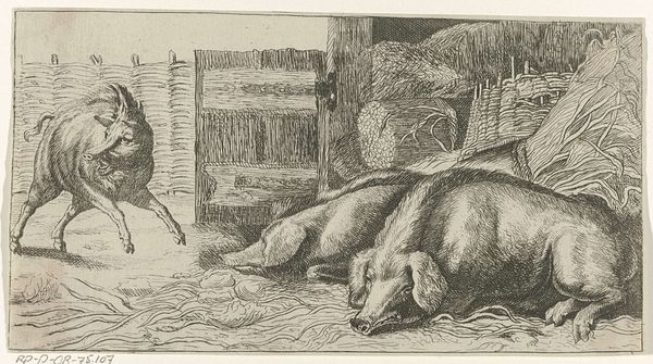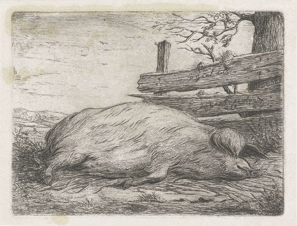 Curator: Welcome. We’re looking at "Liggend everzwijn," or "Reclining Wild Boar," an etching and print by Jacobus Cornelis Gaal, created around 1850. It's currently held here at the Rijksmuseum. Editor: It strikes me as melancholy. There's a certain stillness, a vulnerability to this animal presented in such a quotidian way. The stark black lines against the pale paper create a rather somber mood, wouldn’t you say? Curator: It's definitely a departure from heroic portrayals of animals common in earlier art. Gaal’s interest, characteristic of the burgeoning Realist movement, seems to lie in depicting this wild boar unidealized, perhaps even exhausted. We see it not as a symbol, but as an animal caught in a specific moment in its habitat. Editor: And what is the socio-political context here? Is Gaal making some kind of statement on class, rural life, or perhaps the changing landscape of the Netherlands at this time? Curator: The mid-19th century in the Netherlands was a period of agricultural change and growing urbanization. Works such as this could be interpreted as a reflection on the impact of human activity on the natural world, perhaps highlighting a tension between pastoral life and modernization. Furthermore, hunting was heavily regulated, intertwined with social class. The representation of wild animals also holds implications in art history with regard to genre paintings. Editor: I agree. It's interesting to consider how something as seemingly straightforward as an animal study participates in those larger cultural discourses. And how does the work reflect the power dynamics between humanity and nature? The fence almost seems to imply capture, imposing a boundary in the boar's natural setting. Curator: That is a sharp reading of this, indeed, to me, it suggests our attempt to tame the wild as human culture expands. By stripping away grandeur, Gaal brings forward these subtle yet crucial statements, leaving lasting and intricate dialogues between artwork and beholder. Editor: A reminder that even in simple realism, social commentaries are embedded within. Curator: Indeed, offering fertile ground for discussion on animal agency and cultural control in 19th century art and society.