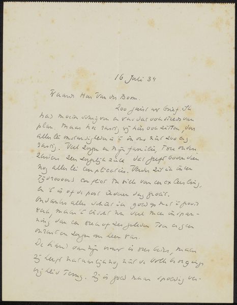 This letter, addressed to A. van der Boom, was written by Richard Nicolaüs Roland Holst on 2 September 1934. The handwritten script sprawls across the page, creating a visual field of looping lines and varied densities. Holst's use of line here is particularly striking. The words cascade down the page, their legibility challenged by the expressive quality of the script. The ink bleeds slightly into the paper, blurring the edges of each character, which speaks to a tension between clarity and ambiguity. Considered through a structuralist lens, the letter functions as a linguistic system, where the sender's intended meaning is mediated through the instability of language itself. The script resists easy decoding, complicating the relationship between signifier and signified. It invites us to consider how the materiality of the letter—the texture of the paper, the flow of the ink—contributes to its overall meaning.