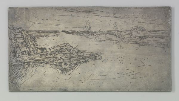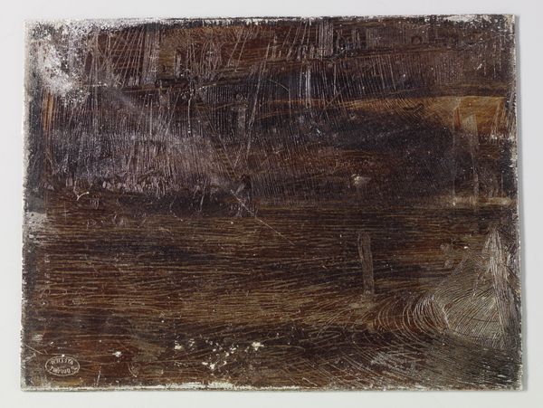 Curator: Willem de Zwart's "Melkende boer," dating back to around 1886, is a fascinating mixed-media drawing, likely incorporating wood. It presents a genre scene within a landscape, quite in line with the Impressionistic tendencies of the period. Editor: My first impression is of a kind of shadowy vignette. It's incredibly atmospheric; the scratches and texture of the wood give it this ghostly, almost haunted feel, even with such a humble subject. Curator: Haunted? Interesting. The scene itself—a farmer milking a cow—feels more like a tribute to rustic simplicity, almost an idealization of rural life so often explored at the time. Do you think the materials themselves contribute to that haunting effect? Editor: Absolutely. Wood, as a symbol, is interesting. Think of all the cultural associations—life, death, the forest as a place of unknowable forces. The medium, coupled with the sketchiness of the lines, suggests transience, memory... maybe a life fading like the image on the wood. Curator: I hadn't considered it in that way. For me, the sketchiness reflects the fleeting moments captured by the Impressionists, but your interpretation definitely adds a layer. The milking scene – is it laden with archetypal symbolism for you? Editor: Perhaps the cow suggests bounty and nourishment, the ever-giving Mother archetype, yet its shadowy rendering here infuses this abundance with vulnerability. It is life sustained, but precariously so. Look how roughly those grassy fields are drawn—evocative of subsistence and labor, the eternal struggle to live off the land. Curator: I find myself oscillating between your darker reading and the somewhat lighter, academic impression it leaves. The mixed media brings such intriguing textural contrasts—almost a blurring between the intended image and the wood’s natural character. Editor: And maybe that’s the heart of it, right? The interplay. It’s not just a genre scene; it’s a dialogue between the subject and its material form, the visible and the unseen—creating something emotionally resonant, lingering far beyond what the humble subject alone conveys. Curator: An emotional resonance indeed, making "Melkende boer" not just an image, but an experience, wouldn't you agree? Editor: Exactly. An echo from another time, continuing to reverberate.