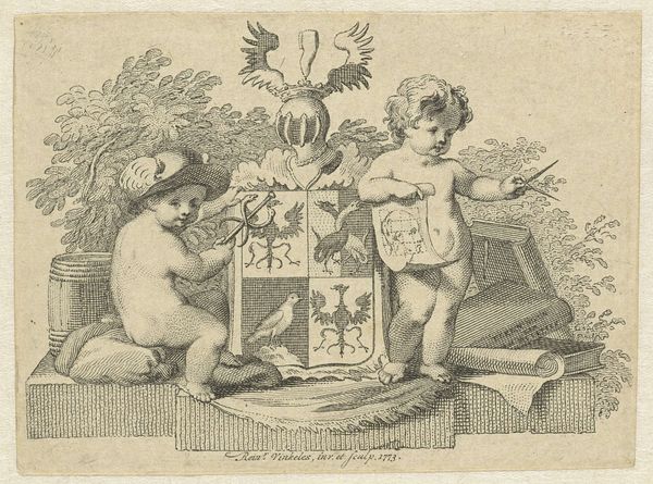 This drawing was made by Reinier Vinkeles in 1782. It's rendered in pen and grey ink, a common combination at the time, allowing for fine lines and subtle shading. Vinkeles used these materials to depict two putti, or cherubic figures, flanking the Schoemaker family crest. One holds a pair of compasses, the other an aesculaap, or staff of Asclepius, symbols of knowledge and healing. The choice of pen and ink speaks to the traditions of both fine art and commerce. In the 18th century, these tools were used not only for artistic expression, but also for technical drawing, writing, and accounting. Consider the labor involved in producing ink, preparing the quill, and mastering the art of fine draftsmanship. Vinkeles' skill reflects the value placed on precision and craftsmanship in Dutch society, where both artistic and mercantile pursuits were highly regarded. This drawing bridges the worlds of art and commerce, reminding us of the intricate relationship between creativity and the material conditions of its production.