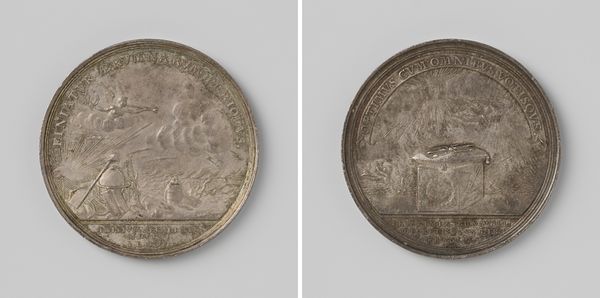 Editor: This object is the "Peace of Hubertusburg, Medal Struck by the City of Frankfurt," made of metal in 1763 by Johann Leonhard Öxlein. It is quite small and unassuming. The images and text seem deeply engraved, creating a tangible historical presence. How would you interpret the meaning of such a commemorative object? Curator: Considering its context, it speaks volumes about how political events are translated into popular memory. Minted shortly after the Seven Years' War, this medal reflects Frankfurt's attempt to solidify and broadcast a narrative of peace, right? Notice the idealized city depicted under a radiant symbol, versus the inscription on the other side. Who was the intended audience and what message were city officials hoping to send? Editor: I suppose they were hoping to project stability, to remind the citizens that Frankfurt was persevering. So it’s less about individual artistry and more about its role in civic self-representation? Curator: Precisely. The medal operates as a form of public art, reinforcing a specific political ideology. Consider how the act of distributing such medals – likely to dignitaries and prominent citizens – shapes perceptions and sustains particular interpretations of historical events. Editor: It's fascinating to think of something so small carrying so much weight – political and symbolic. I never considered how simple, commemorative pieces like these played such a crucial public role! Curator: And consider that this medal exists today, centuries later. How does the medal's survival in museum collections, its study, shape modern understandings about this moment of history and Frankfurt's aspirations? Editor: I hadn’t thought about it like that, this is definitely a different way of viewing a piece, through socio-political context rather than as merely an aesthetic experience. Thanks for opening my eyes.
