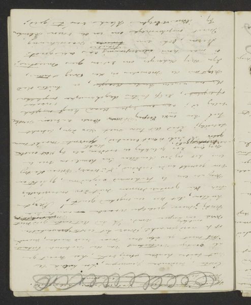 Curator: This is a page from a notebook by Maria Vos, a Dutch artist working primarily between 1834 and 1906. It's simply called "Notitie", made with pen on paper, and is currently held here at the Rijksmuseum. Editor: It strikes me as intensely private—the hurried, almost frantic, handwriting suggests someone trying to capture thoughts as quickly as they surface. There's a sense of immediacy here. Curator: Absolutely. Sketchbooks, in general, are very intimate spaces, aren't they? This kind of textual note provides invaluable insights. The very act of writing and drawing is laden with significance— a tangible manifestation of thought processes. What do you make of that faded script at the edges? Editor: It reminds me of a palimpsest, the way the old layers of writing and meanings subtly affect the current interpretation. You can only catch glimpses, whispers, which evokes for me the transience and ephemerality of life during Vos' time. Perhaps these notes were ways of contending with that constant loss and the marginalization women artists like her were subjected to? Curator: That's a fascinating reading of it. I find the hand-drawn type and stylised text so fascinating, especially if we see this as landscape style in some respects, and if so, is that maybe a sort of commentary from a woman who was a landscape artist in her time? It opens the image up to lots of interpretations when you consider all those elements, doesn't it? Editor: It certainly does. To me, "Notitie" serves as a poignant reminder that art-making, and writing itself, can function as quiet forms of resistance, or perhaps, just existence and that this deeply personal practice by women deserves celebration. Curator: It certainly gives a voice to Maria Vos that transcends the canvas! Editor: I agree. It compels us to consider the multitude of untold stories residing just beyond the frame.