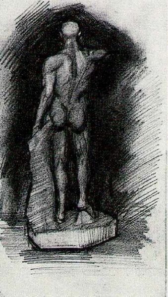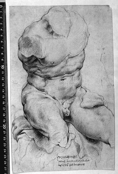 Editor: Here we have Michelangelo's "Study of a Nude Man," created around 1511. The charcoal and pencil drawing feels incredibly powerful. The figure's muscularity and contemplative pose... it's charged. What strikes you most about this piece? Curator: The pose itself speaks volumes, doesn't it? The figure is self-contained, almost withdrawn, despite the obvious physical strength depicted. Think about the Renaissance ideal of the human form, but also the internalized psychological state – do you see how the artist has merged the two? The visible tension held within the limbs and posture tells a compelling story, doesn't it? What do you read into that? Editor: Well, it seems to be portraying some kind of inner struggle, perhaps? Or deep thought, obviously, but the intensity of the musculature hints at more than just a casual musing. It almost feels…tortured. Curator: Precisely! Michelangelo often explored the relationship between the earthly and the divine. Look closely – what recurring shapes do you notice that reinforce the idea of the sacred through the corporeal form? Do certain body parts stand out to you more than others? Editor: The hands, definitely. And the face, although shadowed, seems quite deliberate in its obscured nature, leading the viewer to emphasize their own interpretation. And the repetition of the rounded shapes in the limbs makes it almost architectural, solid. Curator: Exactly. Note how he evokes an experience and invites active reading. Hands have always been an important element within artwork; How does the angle impact your interpretation of what the figure is going through? Editor: That makes me think of how the positioning hides the face further and adds to the somberness. Thanks; it's helpful to understand the symbolism. Curator: My pleasure! It has been quite revealing discussing cultural symbolism with a future art expert!