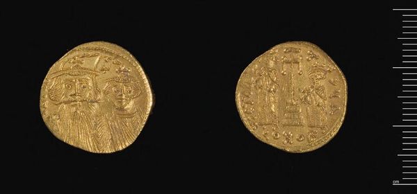 Curator: Here we have a gold coin, "Coin of Herakleios", made by Abd-al-Malik of the Umayyad Dynasty. It is currently located in the Harvard Art Museums. Editor: It's striking how worn it is, yet the figures still seem to command attention. You can almost feel the weight of the gold, and the history it carries. Curator: Indeed, the coin represents a fascinating transitional period. Abd-al-Malik, despite being a Caliph, initially adopted Byzantine imagery, including figures and symbols associated with Heraclius. Editor: So, it’s an appropriation of power through material means? The act of minting in gold, visually echoing existing currency, becomes a statement. Curator: Precisely. It demonstrates the complex interplay of cultural and political forces at play during the early Islamic period, showcasing how rulers used visual language to negotiate their authority. Editor: Seeing it as a crafted object, the choices made in its production – the gold, the borrowed imagery – illuminate the power dynamics of the time far more than any textbook could. Curator: A potent reminder that art, even in miniature like this coin, is never neutral; it's a carefully constructed message embedded in a specific historical context. Editor: Absolutely. It is a testament to how materiality can tell a story of cultural exchange and political ambition.