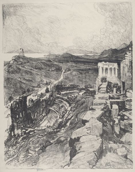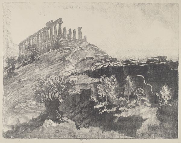 Curator: Welcome. Today, we're observing Joseph Pennell's 1913 etching, "Temple over the Canon, Segesta." Editor: My initial reaction is the dynamism. The deep shadows create such stark contrasts with the almost fragile rendering of the temple above. Curator: Pennell's composition places the temple atop a steep precipice, really emphasizing the architectural structure as the focal point through placement. Note how the geometry of the temple contrasts sharply with the seemingly chaotic, rough-hewn texture of the canon itself. Editor: Indeed, and the material contrast speaks volumes. We see this man-made edifice juxtaposed with the immense weight and enduring nature of the land. Consider the labor that went into the original construction—quarrying, transport, carving—set against the Earth’s slow, geological work. Curator: It is important to remember that Pennell made this during a time of renewed interest in classical architecture. His lines create a sense of depth, the atmospheric perspective giving us recession and height. The play of light on the temple facade enhances the three-dimensionality, while the details of the surrounding landscape recede. Editor: The technique—etching, the controlled erosion by acid— mirrors the slow degradation of even monumental works, really speaking to issues of labor and entropy in the built environment. And what's truly interesting here is how Pennell positions himself within that history, his mark-making becoming part of that story. Curator: There’s an undeniable timeless quality at play, using established methods and imagery, Pennell really creates a bridge between historical grandeur and the present moment. His technique is incredibly important to how this visual metaphor develops. Editor: This tension of man versus nature, history versus the present... It truly elevates this print beyond a simple landscape depiction. We become aware of ourselves, participants within a system, both building it up and seeing its eventual dismantling. Curator: Seeing this print, I think one can truly appreciate the ways in which formal decisions within artwork shape the very impact that art has. Editor: And how vital understanding the process is to appreciating how those decisions relate to the artwork’s world, beyond purely visual attributes.