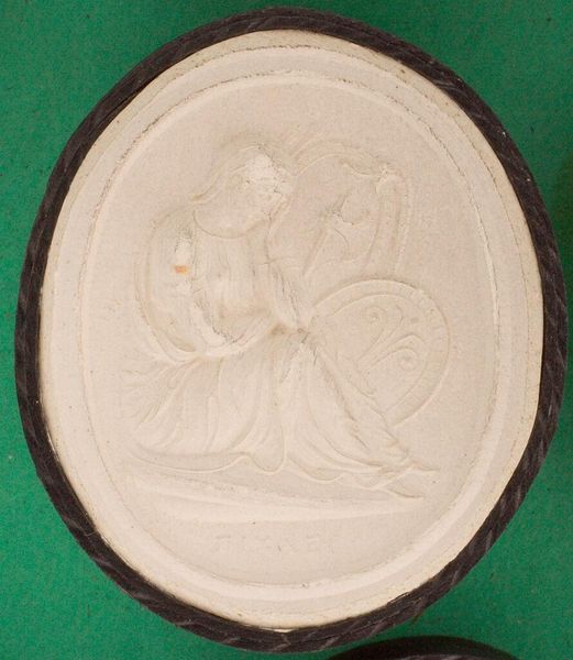 Editor: This is "Lucius Papirius and his Mother" by the Pichler family. It's a tiny, maybe plaster, relief. The figures seem to be frozen in a moment of intense drama. What symbols stand out to you in this piece? Curator: Notice how the figures' drapery both conceals and reveals. The classical garb speaks of virtue and status, yet the clinging folds hint at vulnerability. Do you see how the son leans towards his mother? Editor: Yes, it seems he seeks protection or guidance. Is it typical to show such familial bonds in art? Curator: Absolutely. The mother-son bond, in particular, resonates deeply across cultures. It symbolizes nurturing, authority, and the transmission of values. This echoes through history, doesn't it? Editor: It's incredible how such a small object can hold so much meaning. Curator: Indeed. The Pichler family captured a universal story in miniature.