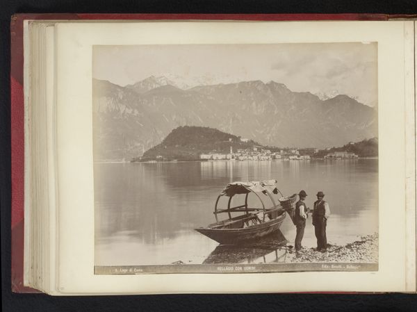 Curator: This gelatin silver print captures a scene of serene beauty; it’s titled “Gezicht op het meer van Como met Monte Crocione,” placing us at Lake Como with a view towards Monte Crocione. It’s attributed to Carlo Bosetti and dates to sometime between 1850 and 1900. Editor: It's melancholic, isn't it? A stillness that almost feels heavy. The palette, a range of sepias, emphasizes the silence of the lake, broken only by that small, empty boat beached in the foreground. Curator: Yes, the tonality certainly contributes to that atmosphere. This type of photographic print became quite popular in the latter half of the 19th century as photography evolved from a niche practice to wider acceptance within middle-class society, landscape views in particular. Editor: What intrigues me is how that little boat—it almost reads like a miniature stage. Does it speak to some idea of travel, or perhaps the isolation one feels even amidst great natural beauty? The mountains loom, vast and indifferent, above human endeavors. Curator: The boat, a potent symbol of transition, journey, the self, could have very well offered a tangible connection for the viewer to participate through vicarious experience and aspire to something greater. Editor: I wonder about its audience too; a middle-class clientele looking to collect these kinds of mementos from the Grand Tour. It represents access, ownership of experience. Were these widely accessible at the time, allowing access to vistas and cultural capital? Curator: Precisely. Photography helped democratize these grand vistas, placing them in the hands of many who perhaps could not physically visit such places. This image could have adorned a parlor room in a home, a constant reminder of the beauty of the natural world or as aspirations to ascend socially or geographically. Editor: So this is landscape not just as art, but as social marker and agent for aspirations. Looking back, it feels like more than just a pretty scene. Curator: Indeed. And viewing that pretty scene today it is an enduring symbol of human interactions with the natural world—complex interplay between longing, conquest, and perhaps also humility.