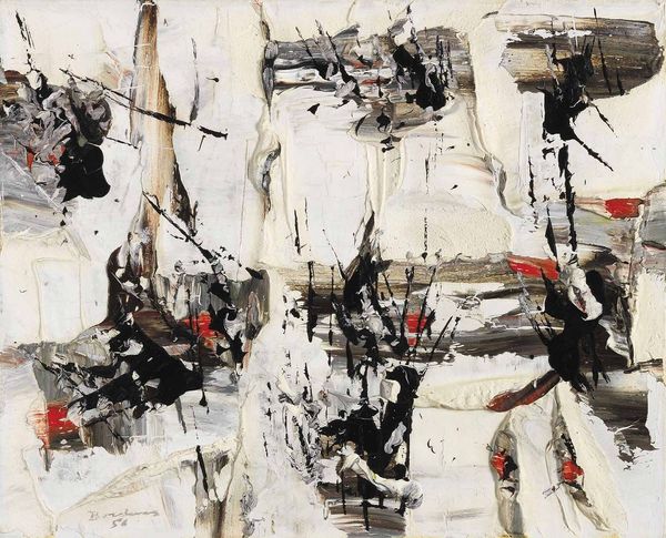 Curator: Oh, my, this one practically vibrates! Looking at Huguette Arthur Bertrand’s “Obliquement et a travers” from 1946—French for "Obliquely and Through"—I'm swept away by its sheer energy. Editor: It certainly makes a strong statement. I’d describe its mood as intense. It feels like an explosion caught mid-blast, a whirlwind of earthy tones battling stormy greys. Given it's Art Informel style and dated from just after the war, I immediately wonder how socio-political tensions influenced this painting. Curator: Yes, an explosion inwards, maybe? The canvas itself, soaked with oil, becomes a record of this internal struggle. It is as though she captured what's not clearly seen—sensed, rather—but profoundly there all the same, oblique hints, little explosions of insight coming through... Editor: Intriguing. The title certainly points to that notion of "through" something. Her engagement with the canvas – layering and scratching, I presume – really exemplifies matter painting, right? How paint becomes almost sculptural, charged with meaning. The context of post-war artistic movements often shows artists searching for new forms of expression that reject pre-war aesthetic conventions. Curator: Precisely! Think about what Bertrand and other Art Informel artists were up against. There's a rejection of form and traditional perspective... In fact, its a dive headfirst into pure gesture. A very instinctual rebellion. It's the visual equivalent of raw emotion! Editor: Yes, it also rejects traditional approaches of representation, questioning not only HOW to depict reality but also WHAT constitutes it after immense trauma and destruction. This work is more than an aesthetic creation, isn't it? Curator: Definitely. For me, its strength isn't just in its historical positioning or its raw texture; it lies in its very human, and flawed, struggle for sense. Looking for light through dark. Finding glimpses through all the chaos. It leaves one feeling less alone, more connected to the beautiful, brutal reality. Editor: I appreciate how this artwork provides a portal into a historical time. We began talking about its intensity and its powerful, material presence— now I walk away pondering not just artistic intent, but societal impact. Thanks for walking me through it. Curator: Thank you! "Obliquement et a travers" always ignites a sense of hopeful turbulence in me, even after all these years. What a gift.