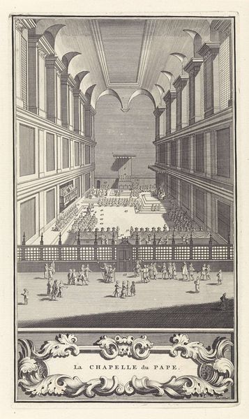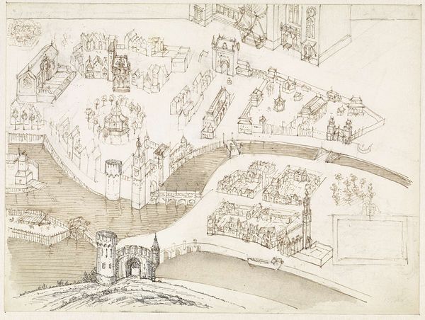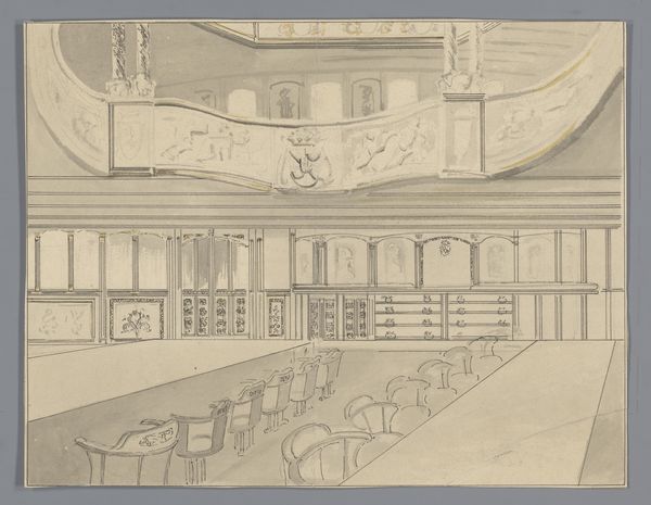 Editor: So, this is Willem van Swanenburg's "Bibliotheek van de Universiteit van Leiden" from 1610. It's an ink and pen drawing. The detail is just incredible, but there's something about the space itself that feels almost… theatrical, like a stage set. What do you see in this piece, beyond just a depiction of a library? Curator: Theatrical is spot-on. It's not just about showcasing the Library, it's a stage for humanist drama! Look at the figures—they're arranged almost like actors. Each group seems to be having its own hushed intellectual discussion. What stories are unfolding? This space, filled with knowledge, isn't a quiet tomb. It's brimming with potential. Editor: I like that: "brimming with potential". I guess it shows a lot of life for being from so long ago. How would the perspective fit into your stage analogy? Curator: Absolutely. The perspective is crucial – notice how the artist expertly uses it to draw you into the heart of the Library? It's not just about showing the shelves receding into the distance; it's about creating a space that feels both expansive and intimate. It’s an invitation to join the play! Also, don't you think these Dutch Golden Age people in all their academic hustle remind us of contemporary library-goers? I find it humorously reassuring that our struggles for knowledge have remained constant over such long spans. Editor: It kind of does! I'd never really thought about it that way before. It’s like even in the 17th century, students were stressed about exams in the library. It’s a neat paradox, and puts my modern library struggles into a really awesome art historical framework. Curator: Exactly! The artist immortalizes them and, maybe inadvertently, us. Through that, this drawing bridges centuries. Next time you are feeling bogged down in research, picture the hustle and bustle frozen in this scene. Perhaps you may find yourself as yet another eternal character, another bit actor in the pursuit of enlightenment. Editor: Definitely. It makes me appreciate the timelessness of the pursuit of knowledge and, like, my little place within it. Curator: Precisely! A beautiful library interior like this captures the spirit of scholarly exchange, then and now.