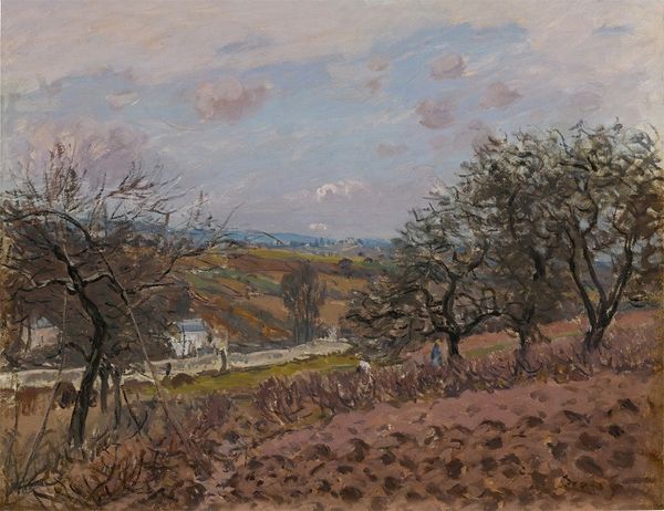 Editor: We are looking at “Les Coteaux de Gisors, Temps Gris”, or “The Hillsides of Gisors, Gray Weather” by Camille Pissarro, painted in 1885. It’s an oil painting, seemingly done *en plein air*, and the first impression is the stillness, the quiet of a landscape under a muted sky. What can you tell us about this piece? Curator: What strikes me is Pissarro's dedication to representing the ordinary, everyday life outside of Paris. This wasn’t the glittering image of modernity promoted by some of his contemporaries. This work, painted around the time of significant social upheaval and increasing industrialization in France, poses questions about labor, land, and rural existence. Editor: So, how do we read a landscape through the lens of social commentary? Curator: Consider what’s *not* prominently displayed. The absence of overt industrial elements despite their encroaching presence in rural areas – only a smokestack peeks above the horizon – speaks volumes. He presents an unromanticized, perhaps even melancholic, view of rural life in the face of these changes. Do you notice anything about the figures? Editor: Yes, they almost blend into the green landscape, their identity concealed. Curator: Precisely! It acknowledges the working class in rural environments without sensationalizing or idealizing their experience. Pissarro consistently sought to depict laborers without romanticizing poverty, thus respecting their reality. Editor: I never thought a landscape could be so layered! I'm rethinking my perception of Impressionism. Curator: Exactly. Art is always engaged in dialogue with the issues of its time. Looking at the relationship between the figure and ground allows a deeper reading. It leaves me wondering how the social dynamics are deeply rooted in our perception of landscapes.