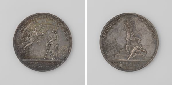 Curator: I am struck by the sharp contrasts, the raised figures, and the clean, precise lettering that encircles these images. It creates a very ordered, almost rigid, presentation. Editor: You’re right, it’s all very deliberate. What we’re looking at is a medal created by Daniel Friedrich Loos in 1815. The medal commemorates the signing of the second Treaty of Paris which marked the end of the Napoleonic Wars. It is crafted from metal, a common material for medals designed for wide circulation. Curator: Knowing its context, the imagery makes complete sense. The figure with the olive branch, she must represent Peace, dispensing blessings upon the world. It speaks volumes about the aspirations of the era, a longing for stability and renewed prosperity after so much conflict. It shows just how art was deployed as propaganda to rally the citizens. Editor: Precisely. And turning to the other side, we see Athena and other allegorical figures vanquishing war and destruction, ushering in a new age. Notice how the composition divides the narrative – the treaty on one side, the consequences of it on the other. What strikes you about the artist’s choices here? Curator: Well, Loos certainly leaned into the Neoclassical aesthetic popular at the time. The figures are idealized, almost statuesque in their form, recalling Greek and Roman sculpture. The engraving, although small in scale, attempts to convey grand narratives, much like history paintings do on a large canvas. Editor: True, the scale works against it. The figures and text appear quite compressed; one might argue Loos had a challenge adapting that epic theme to fit this limited medium. Curator: Yet the density of the image also emphasizes the enormity of the event it commemorates, compressing that historic weight into a tangible object. The act of holding such a coin creates a palpable link to that moment in 1815. Editor: Yes, its symbolic importance certainly outweighs its material size. Thinking about how conflict and reconciliation shape societies and artistic expression, is really thought provoking. Curator: Indeed, Loos gives us more than just a snapshot of the past; he gives us a reminder that peace, like art, is often carefully constructed.
