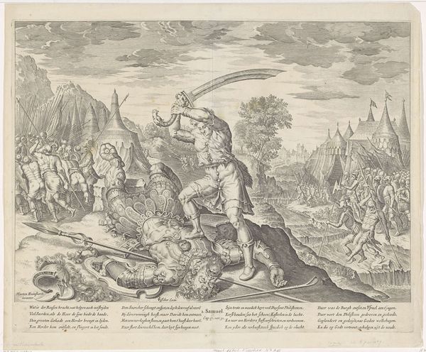 Editor: Here we have "Diana op jacht" (Diana on the Hunt), an engraving dating from between 1681 and 1734, by Andrea Procaccini. There's a tremendous amount of action depicted. I’m immediately struck by how the composition guides my eye. What do you see in this print? Curator: It's crucial to recognize how the artist utilizes line to create depth and movement. The density of the etched lines dictates areas of light and shadow, thus modeling form. Notice how the figures in the foreground are delineated with far more precision than those receding into the background. How does this recession, achieved purely through line and composition, affect the viewer's reading of the narrative? Editor: It definitely emphasizes the foreground and draws me into the hunt. So, the lines almost function as a type of perspective? Curator: Precisely. Consider also the baroque dynamism inherent in the composition. Observe the arrangement of bodies – the straining dogs, the collapsing boar, the actively striding Diana – how does the artist utilize curvilinear forms to imply action and direct our gaze? Editor: I see what you mean; there are so many implied curves throughout the scene, all working together to convey that feeling of intense movement. Curator: And let us consider the formal implications of printmaking as a medium. The ability to reproduce and disseminate such imagery had a profound effect on the artistic landscape of the era. Editor: So, it’s not just about the scene itself but also about the role of printmaking at that time and how it enabled the wider circulation of these ideas? It provides a formal context too. That's really insightful. Curator: Indeed, a true understanding of the work requires an awareness of these interwoven elements.