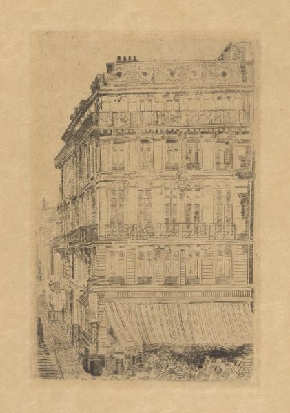 Editor: This is "Palaces, Brussels" by James Abbott McNeill Whistler, made in 1887. It’s an ink drawing on paper and I am really drawn to its loose lines that still suggest such grandeur. What do you see in this piece? Curator: Well, the subject matter—palaces and Brussels—immediately conjure a symbolic interplay. Palaces themselves are potent symbols of power, authority, and history. The image becomes a memory, echoing through the history of Europe, no? The question becomes what did palaces mean to viewers then, in comparison to what they evoke now. Editor: That's an interesting idea – I never thought about palaces holding different meanings. So how can we approach this evolution of meaning through the visual representation of "Palaces, Brussels"? Curator: Note how Whistler captures this scene not with rigid precision, but with these very free and loose strokes. He uses a suggestive visual language. This city is layered, but with a sense of detachment that suggests that his modern, urban experience stands at a remove from what those buildings and locations once represented. This palace feels very separate from its street-level view. Editor: Ah, I see what you mean! He's not really showing us what a palace is but what it meant at this moment to see the palace. The hustle of commoners versus a symbol of royalty feels right in line with modernity. Curator: Exactly! It invites us to reflect on how the image of authority, in the form of historical locations such as Palaces, evolves within the urban consciousness of a society undergoing intense social and political shifts. What do these emblems hold for us today? Editor: It's really eye-opening to see how such simple lines can convey so much history and societal commentary. I’ll never look at a building the same way.