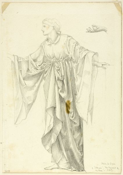Editor: Here we have John Downman's "Antique Statue of Standing Draped Woman," created in 1774 using ink, graphite, and pencil on paper. It’s a delicate sketch, almost ethereal in its lightness. What strikes you about this work? Curator: I see a study in power dynamics, refracted through the lens of classicism. Consider the historical context: 1774, right on the cusp of revolutionary fervor. The figure, derived from idealized Greek or Roman forms, stands as a symbol of authority, but is also, interestingly, a copy. Downman’s act of redrawing the statue calls attention to how power is constructed, mediated, and ultimately, mutable. Doesn’t the sketched nature of the image also imply something about the precarity of those ideals? Editor: That's fascinating. So, you’re suggesting that even while emulating classical ideals, the artist subtly undermines them by using impermanent materials and suggesting instability? Curator: Precisely. The very act of drawing, instead of sculpting, the form introduces a level of artistic interpretation and questions our relationship to legacies of power. What are the implications when men draw women figures like this? Editor: That raises a good point – the gaze and its historical context certainly influences interpretation. It feels relevant when examining classicism and it's place within art history. Curator: Exactly. And the ‘unfinished’ quality? We’re left contemplating the incomplete project of emulating classical authority, a project rife with implications about gender, representation, and power in the late 18th century. Food for thought, wouldn't you say? Editor: Absolutely. It's challenged how I initially viewed this drawing.