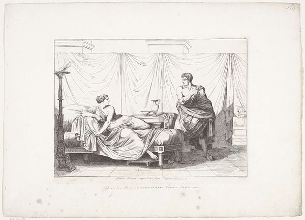 Johann Heinrich Meil created this print titled 'Fable of the Doctors'. Here, we see a sick man in bed, attended by two doctors. The scene overflows with symbols of medicine and mortality, but it's the bed itself that commands our attention. The bed, since antiquity, has been more than mere furniture. It's a stage for life's most intense dramas: birth, love, sickness, and death. The canopy bed here, with its heavy drapes, evokes a sense of enclosure, almost like a womb or a tomb. The sickbed motif resurfaces through art history, notably in medieval depictions of the death of the Virgin Mary and Christ's Passion. These settings speak to our collective anxieties about health, helplessness, and the inevitable end. The emotional power of the image resides in its stark portrayal of human vulnerability, engaging viewers on a deep, subconscious level. This imagery reminds us of our shared mortality. A powerful and timeless memento mori.