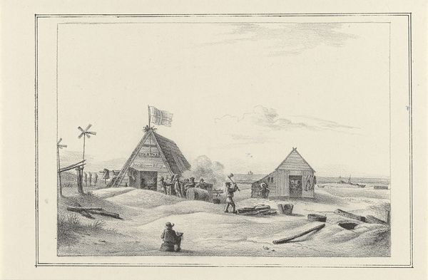 Curator: Jens Juel offers us a serene, wintery tableau with this painting, titled "Vinterstykke Forestillende Udsigt Til Søelyst Fra Ordrup Med En Kanefærd." Editor: It has an ethereal quality. The landscape's blanketed in snow, giving it a sense of quiet and isolation, yet the figures suggest a bustling daily life even in this frozen stillness. Curator: Absolutely, and the oil paint contributes a tactile dimension, layering the textures of snow, wood, and sky. We have here a genre scene but also something archetypal, no? A suggestion of Winter's enduring symbolism. Editor: I agree, the scene captures a very particular lived reality. Look closely and you see the societal structure subtly highlighted. Note the leisure of the sleigh riders, compared with those more exposed trudging through the snow on foot. It prompts thoughts about social mobility, even visibility, or the lack thereof. Curator: That resonates. I see this, too, as being very deliberately composed. Notice the subtle symbolism embedded in the color choices; white of course is pure, almost a blank canvas upon which human actions write their own story. Also how light seems almost to struggle against dark, suggesting themes such as overcoming. Editor: The painting serves as a lens to reflect upon privilege and precarity, power dynamics solidified across a frozen landscape. Consider how the toasty glow emanating from the houses contrasts sharply with the stark environment faced by the anonymous figures. What did they seek from society and vice versa? Curator: I think that's a very useful line of thought. Now when one is looking through history for deeper answers about culture as symbol, and how artworks speak to our past experiences as social animals... This makes an artist an enduring conduit between now and then. Editor: The artwork is not merely picturesque. Its value today emerges when considered an historical document capable of evoking deeper sociopolitical understandings. How does it mirror the structures that influence lives even today? Curator: Agreed. Ultimately, it seems like Juel is handing us more than a vista. Editor: Precisely, it provides us with lingering visual prompts.