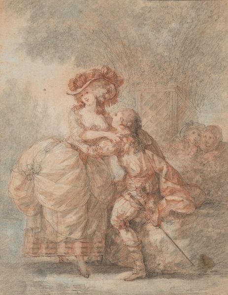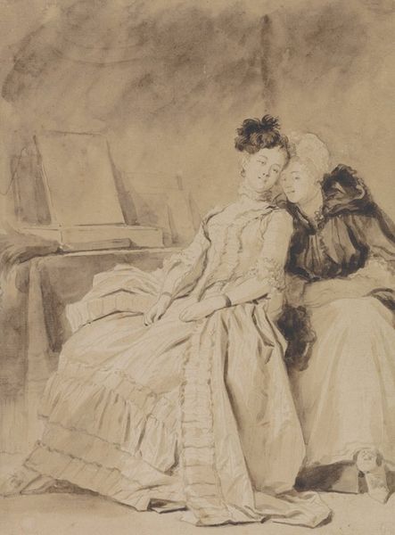 Jean-Honoré Fragonard created "The Letter, or The Spanish Conversation," a drawing now held at the Art Institute of Chicago. Rendered in delicate brown washes, the composition immediately draws us into an intimate, almost theatrical space. Light and shadow dance across the scene, animating the textures of fabric and flesh. Fragonard masterfully uses line and form to evoke a sense of fleeting, whispered exchange. The architecture of the scene, with its heavy curtains and plush cushions, frames the figures, focusing our attention on their interaction. We might consider this in light of the semiotic structures of 18th-century courtship, where letters and private conversations held significant weight in the negotiation of social and romantic bonds. The subdued palette and fluid brushstrokes contribute to the sense of secrecy and intrigue. The lack of sharp detail invites us to fill in the narrative gaps. Thus, the drawing functions as a stage upon which viewers project their own interpretations, highlighting the instability of meaning within artistic representation.