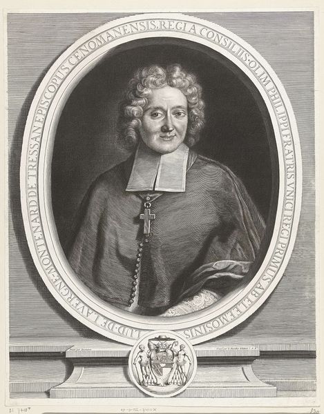 Curator: Here we have Gérard Edelinck’s portrait of Louis de La Vergne-Montenard de Tressan, Bishop of Mans. The work, held at the Harvard Art Museums, captures a man of obvious importance. Editor: The Bishop seems very self-satisfied, doesn't he? Look at how the cross dominates the composition and the way the curls seem so carefully arranged. Curator: What fascinates me is Edelinck’s technical skill. The layering of lines to create tone, the precision of the lettering in the oval frame, the use of line to depict fabric—remarkable craftsmanship. Editor: The imagery is quite potent. The oval, the Latin inscription, the Bishop's garb, they all speak of authority. Even the coat of arms at the bottom reinforces the status conferred by both family and church. Curator: The artist clearly understood the market for these prints and how they were consumed. This image provided a material connection to power. Editor: Yes, the symbols here communicate so much about the Bishop's world and enduring influence. Curator: Indeed. Edelinck's mastery reveals a fascinating intersection of skill, labor, and social standing. Editor: A convergence of visual language and power, frozen in time.