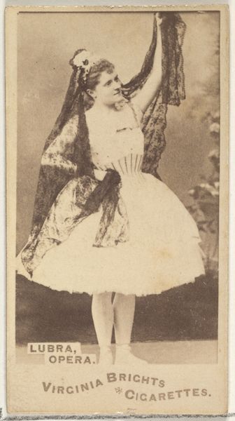 Curator: What strikes me immediately is the almost unsettling theatricality of this pose—it's difficult to imagine this kind of portraiture divorced from performative gender constructs and the gaze they’re meant to elicit. Editor: I can appreciate that interpretation. My initial response is drawn to the tonality and balance of light within the piece. It’s all so delicate! We’re looking at “May Grosvernor, from the Actors and Actresses series (N45, Type 1) for Virginia Brights Cigarettes,” a collotype print dating between 1885 and 1891 by Allen & Ginter. Curator: A cigarette card! Immediately, we are plunged into a history of promotional materials and the use of actresses' images to market a product—reinforcing a commercialization of female beauty and fame that continues to this day. Think about who the audience was and what they expected. Editor: Yes, its original context as a mass-produced promotional item influences how we perceive the imagery itself. Looking closer, I notice the sharp contrast between the intricate details of Grosvernor's costume, rendered with surprising precision, and the almost blurry backdrop. The image plane is really compressed with very limited depth of field. Curator: Indeed, and the costume itself speaks volumes. The feathered headdress, the abbreviated skirt... it’s all carefully designed to create an exotic, playful persona. Consider the colonial implications as well; these costumes often borrow from, or rather, appropriate, indigenous cultures and distort them for entertainment purposes. How do we read this exoticization today, especially in relation to ideas of Orientalism and appropriation? Editor: That's a potent point. I’m drawn back to the textural quality that comes through in the print itself. There's something tactile in the way the light catches the fabric and embellishments that would be very seductive in the hand. Curator: Precisely. Even within the constraints of a small cigarette card, the designers are leveraging visual codes to create a narrative – however problematic. Seeing this image in a museum collection raises complex questions about labor, marketing, and celebrity that stay with you long after you walk away. Editor: It’s always compelling how aesthetic choices reveal embedded power structures and societal ideas. Examining its formalism gives us insight, while understanding its socio-historical moment allows a much more critical dialogue with this work of art.