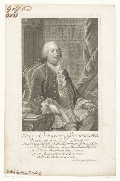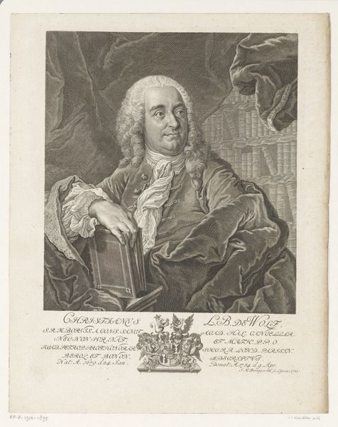 Curator: This engraving from 1760, found here at the Rijksmuseum, presents a portrait of Paul Jacob von Marperger, attributed to Johann Wilhelm Windter. My attention is immediately drawn to the intricacy achieved through what appears to be meticulous metalwork. Editor: My first impression? A man caught in a moment between worlds – that elaborate garb screaming aristocracy, but the backdrop hints at the burgeoning Age of Enlightenment. Curator: Absolutely. The formal elements clearly display the enduring influence of Baroque aesthetics: rich detail, elaborate compositions—everything underscores power and status, conforming to historical norms for portraying public figures. The text integrated into the piece reinforces these notions by literally inscribing Von Marperger's legacy through the work itself. Editor: Yet there's a restless energy. I mean, the billowing cloudscape, the implied gesture outwards—almost as though he's inviting us into the future even as he's anchored by those heavy classical pillars. Curator: Consider the technique required for an engraving of this complexity. Think of the labour invested in each precise line, the planning necessary to translate flesh and fabric into marks upon metal! The print would be infinitely reproducible and circulated widely, imbuing its sitter with power across vast networks of exchange and viewing. Editor: And it democratizes him in a way, doesn’t it? This object, this portrayal, makes Von Marperger tangible, somehow mortal. A printed portrait shrinks the space between nobility and the everyman gazing upon it, maybe even offering a glimpse beyond just pomp. I keep circling back to his hand... extending a silent offer. Curator: Your focus makes sense. He extends both status and invitation. It shows how the artist utilized available techniques of mass production of that era to mediate power to build cultural connections. These portrait engravings acted as documents cementing place of those individuals in public life through widespread, almost democratic viewership. Editor: You’ve contextualized its presence beautifully. Seeing beyond Von Marperger as the ‘subject,’ to understanding this as object—manufactured, marketed, meaningful on multiple layers. Curator: Exactly. And by investigating further through materials of its making, and its role during his time, perhaps you and I came to understanding more than initially perceived when regarding art like Von Marperger.