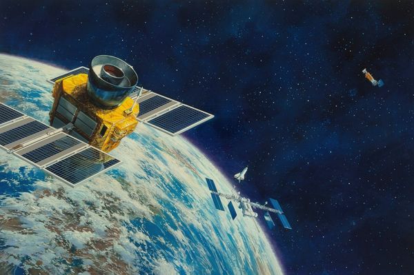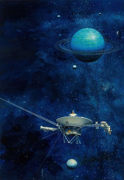 John Conrad Berkey created this captivating artwork in the science fiction age, its precise date currently unknown. At first glance, one is struck by the interplay between the cold, geometric shapes of the space station and the organic nebulous forms that surround it, rendered in deep blues and oranges. Berkey masterfully contrasts the man-made and the natural, the ordered and the chaotic. The station itself, a symphony of cylindrical and spherical forms, juts into the void, challenging our understanding of scale and perspective. Notice how the sharp, industrial lines of the station are set against the swirling, impressionistic brushstrokes of the cosmic backdrop. This juxtaposition creates a tension, a visual paradox. The station, a symbol of human ingenuity, appears almost vulnerable against the vastness of space. Consider too, how the artist employs color to further emphasize this duality – the cool, metallic tones of the station versus the fiery hues of the cosmos. The painting invites us to reflect on humanity's place in the universe, and our eternal quest to understand and conquer the unknown.