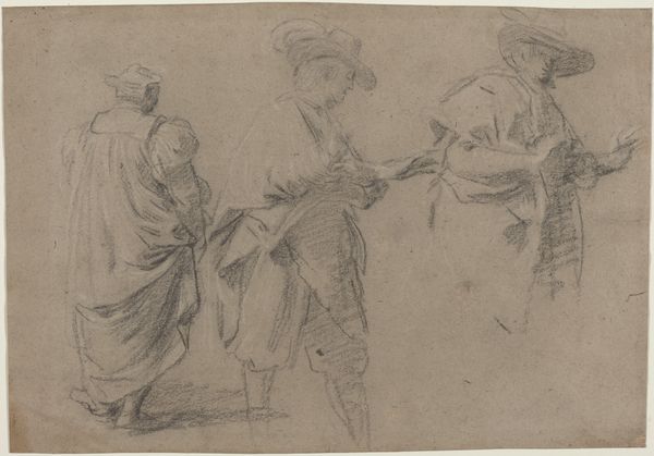 Curator: Stefano della Bella’s etching, titled "A Pole Holding a Horse by the Bridle," made sometime between 1657 and 1667, captures a scene from a bygone era. Editor: It's striking how much detail he achieves with just a few lines. There's an immediacy, almost like a snapshot. A very intimate glance at the men and horses of the baroque era. Curator: Della Bella, celebrated for his skill with etching, seems to be channeling the genre paintings of his time. We see these figures—the Pole and the horse but also some other men in the background—presented in a way that emphasizes the trappings of rank. Note the fashionable dress and the careful rendering of the horse’s harness and feathers. Editor: It’s intriguing to me that it’s called "A Pole" instead of "The Pole." As if his identity is somehow interchangeable. This is especially potent because of the baroque use of portraiture as symbols of power and social class. Is Della Bella implying some kind of deeper meaning? Curator: You bring up a fascinating point, since symbols can tell the complex story of a shifting identity through art and portraiture. Maybe his name or individual significance matters less than his archetype, as an exotic figure, perhaps part of a larger diplomatic or military engagement. His social class on full display. Editor: The work highlights this tension of individuality and how much it relates to collective power. How important he might be—or is, or will be. Especially knowing this was done during the baroque, and especially how that affected European politics and identity. Curator: I would argue it’s about the moment he's trying to capture more than the men themselves. There’s something in the temporality here, maybe even fleeting nature of identity, as an observation of the past. Editor: So, seeing this figure captured, frozen in time and space—perhaps just reminds us of that impermanence. An almost brutal and existential capture of class and hierarchy that are still very relevant to this day. It does not hurt anyone to consider. Curator: Perhaps in those fleeting moments of visibility, Stefano della Bella makes you ponder that which exists far beyond any kind of identity, even something to take to heart and remember beyond just a genre scene. Editor: An identity is never that easy to capture in the first place.