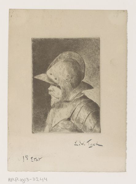 Curator: This is "Man in harnas," a print etching and pencil drawing by Edouard Tyck, created sometime between 1857 and 1913. Editor: The portrait possesses a stark, stoic quality. It’s somber, really; almost melancholic. The details are impressive given the limited medium—there's a palpable weight in the armor. Curator: Yes, let's consider what this armor represents. Across cultures, armor symbolizes not only physical protection but also a complex layering of societal roles and constraints. In this rendering, who is protected? Editor: It speaks of the enduring imagery of strength and power—but also hints at vulnerability. Armor conceals as much as it protects; maybe we see a symbolic division of public versus private persona here? Curator: Intriguing observation, given that the artwork falls within a period where the artist grapples with evolving notions of masculinity and national identity. The subject’s profile is deliberately stoic. The light, which subtly falls onto the helmet and chest piece, further reinforces ideals of service, discipline and allegiance, particularly when considered in the wake of major societal shifts during the artist’s time. Editor: I agree. The man’s hidden face creates an almost impenetrable aura, reflective of a complex interplay of fear and power. The visual language suggests a rigid hierarchy, potentially reflecting social inequalities that affected various identities across the Western landscape during Tyck's lifetime. Curator: Also consider the work’s execution, using print etching to replicate and distribute the image widely. This speaks directly to questions about accessibility, readership and how the ideals embodied within could be circulated for varied ideological purposes. Editor: Looking again, the artist's precision makes me question its realism, since in stark reality no one's image truly lives up to an artistic ideal. Yet this controlled image endures... it continues to resonate! Curator: This intersection of art, history and identity offers us crucial insight on its intended audience. Editor: Yes! "Man in harnas," though modest in medium, leaves a significant footprint on our shared cultural consciousness.