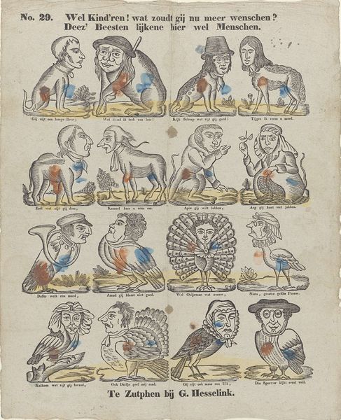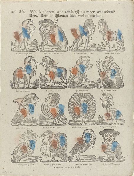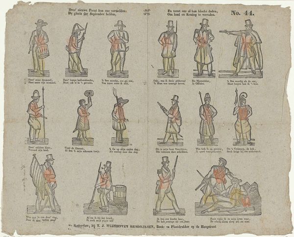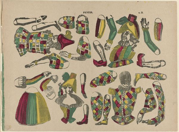 Editor: This piece, "Trekpoppen," which roughly translates to "travelling dolls," is from between 1827 and 1894 and is at the Rijksmuseum. The artist is M. Hemeleers-van Houter. It's mixed media, including etching, watercolour, and coloured pencil on paper... it’s giving me an eerie childhood nostalgia, almost like looking at a disassembled toy waiting to be brought to life. What can you tell me about its historical context? Curator: Well, it's fascinating, isn’t it? "Trekpoppen," with its assembly of characters ready for play, speaks volumes about 19th-century Dutch society and the role of entertainment. Think about it – these aren't just dolls; they are figures representing different social roles, like the fashionable lady or the drunkard. How might this have shaped a child's understanding of societal hierarchies or even morality? Editor: That’s interesting…So it’s not just about play? I can see now that the figures actually present stereotypes through their costumes, right? Is this some form of commentary on societal roles and moral standing that the artist is putting on display here? Curator: Exactly! The piece’s placement within the Rijksmuseum transforms it into more than just a children’s game. Consider the politics of display. How does exhibiting “Trekpoppen” alongside traditional fine art shape our perception of childhood, leisure, and even the value we place on different forms of cultural production? The museum space grants it a new layer of significance. Editor: So the very act of putting it in a museum…it kind of elevates a simple child's game to high art? It’s like saying these stereotypes are an important part of the culture. I never thought of it that way. Curator: Precisely! And in doing so, it prompts us to examine our own role in perpetuating or challenging these societal constructs and biases. Editor: It is definitely food for thought, seeing what appears like innocent fun is actually laden with these subtle messages from the past. Thanks for shedding some light!