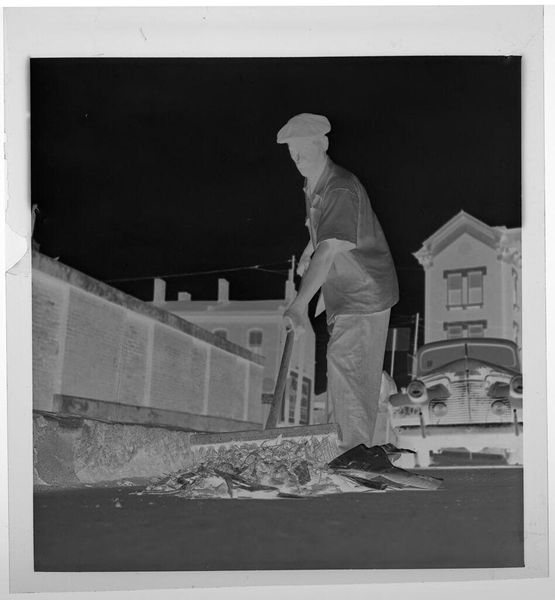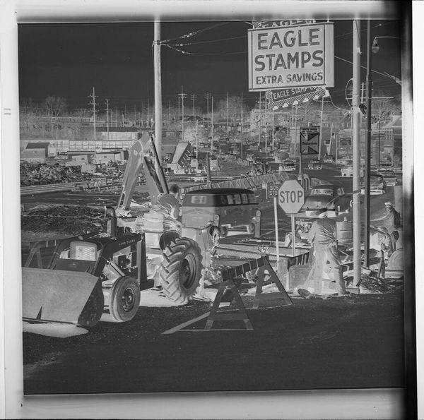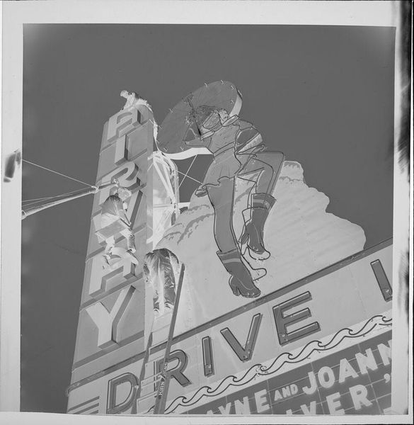 Editor: This photograph by Jack Gould, titled "Untitled (neon sign for drive-in theater)," captures workers repairing a large sign. I find the composition striking—the angles and overlapping forms create an intriguing visual puzzle. What do you make of this image? Curator: The photograph's strength lies in its manipulation of form. The stark contrast between the geometric sign and the figures creates a dynamic tension. Note how the photographer uses the lines of the sign to guide the viewer's eye. Editor: So, the subject matter itself is less important than the way it’s presented? Curator: Precisely. The arrangement of shapes, the interplay of light and shadow, and the overall composition are what truly elevate this image. Editor: I never thought about it that way; it’s about the pure visual elements working together. Thanks!
