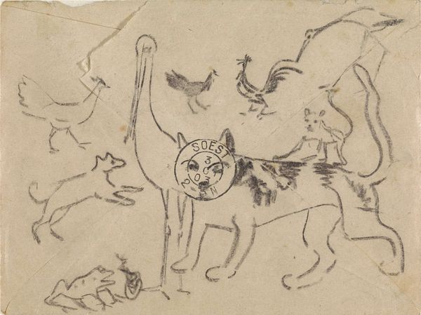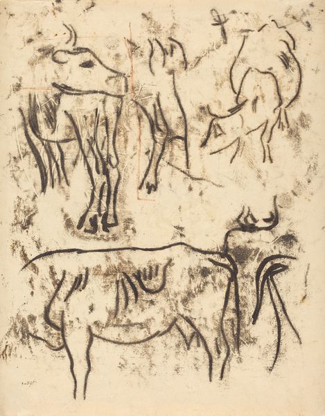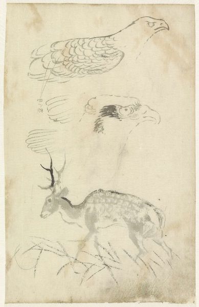 Curator: Rodolphe Bresdin's small drawing, "Deer in a Landscape," presents us with a fleeting vision of wildlife. It’s part of the collection at the Harvard Art Museums. Editor: My first impression is one of fragile vulnerability. The thin lines barely contain the forms. They seem poised to vanish into the paper. Curator: Deer, across cultures, often represent gentleness and a connection to nature. But the starkness of the drawing style here complicates that, doesn't it? Editor: Absolutely. The lack of shading and detail gives it an almost allegorical feel, stripping away sentimentality. They become emblems of a disappearing wilderness. Curator: Perhaps Bresdin, living through a period of intense industrialization, intended to capture that sense of loss and the precariousness of the natural world. Editor: I hadn't considered the social implications. Seeing it that way reframes it from a simple pastoral scene into something more profound. Curator: Exactly, the deer transform from being picturesque into a symbol of cultural anxiety about modernity. Editor: It's astonishing how a small drawing can contain so much. I see it differently now. Thanks.