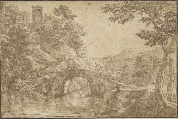 Curator: Giovanni Francesco Grimaldi's pen and ink drawing, simply titled "View of Isola Tiberina," presents a sweeping cityscape rendered with remarkable economy of line. Editor: It's dreamlike, almost ethereal. The sparse lines create a sense of distance and quiet contemplation. What I find striking is that tree, arching so dramatically as a counterpoint to the rigid architectural background. Curator: Indeed. The tree introduces a vital element of dynamism against the stoic architecture, and is visually counterbalanced by the figures on the opposing bank. Grimaldi's use of line here is strategic, employing hatching to create depth and variation, particularly in the depiction of foliage and water. We might consider the structural oppositions. Editor: Focusing on its symbolic register, Isola Tiberina has been linked to healing cults since ancient times. It stands in the river as a place apart. Curator: That separation is critical to our reading of the image as a whole. Isola Tiberina serves as a liminal space within the architectural construction of the city. Editor: The bridges in the image link Isola Tiberina to the surrounding banks. These spans seem laden with allegorical possibility: passages from the earthly to the spiritual realm, for example. Note too, that bridges are traditionally potent symbols of connection but also fraught with the potential for collapse or traversal in the wrong direction. Curator: Yes, each element is carefully considered in terms of its spatial arrangement, too, serving to either connect disparate regions within the pictorial field, or re-enforce their compositional distance. We can think of the whole picture as a system of semiotic exchanges, constantly working to create a subtle set of thematic possibilities. Editor: I love how these delicate lines can tell so many stories, blending observed reality with deeper cultural meanings, beckoning to a collective memory through carefully placed iconography. Grimaldi invites us to find solace there, perhaps, on that island sanctuary, somewhere removed from the immediate chaos, yet integrally connected. Curator: Absolutely, a place of refuge—accessed through formal lines of perspective, light, shade, and shadow play that engage viewers across a careful structural composition. The interplay between surface and depth here offers an inexhaustible trove of expressive capacity.
