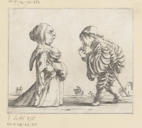 Editor: This engraving by Zacharias Dolendo, titled "A Man with a Turban Leading a Woman Who is Wearing Peacock Feathers," is striking. The figures seem so elaborately costumed. What can you tell me about the context of this image? Curator: Consider how the print functions within a culture grappling with expanding global interactions. The turban and peacock feathers signal an engagement with the "exotic." What does it mean when dress becomes a form of cultural appropriation, particularly in a society structured by hierarchies of power? Editor: I hadn't thought about it that way. So, the artist might be commenting on cultural appropriation through the clothing of the figures? Curator: It's a possibility. What does it tell us about the wearer, and the society observing them, that they chose to present themselves in this manner? Who is this performance for? Editor: It's fascinating to consider the layers of meaning embedded in something as seemingly simple as clothing. This image speaks to the complexities of cross-cultural exchange. Curator: Precisely. It urges us to question how visual representations can perpetuate or challenge social norms.