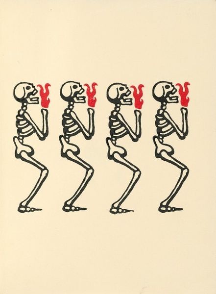 This 'tattoo' book was made by James McCracken Jr. at some point in his life, using ink on paper. It's fascinating how McCracken uses simple black lines to construct this dancing skeleton, like it's shaking its bones off. The green skull motifs that surround it give the piece an extra layer of spooky fun. The texture looks smooth, and the colors are bold, so you know this was a deliberate choice. I’m wondering if it might be screen-printed, or maybe even stamped. Look at the way the forms are outlined with a strong, unwavering line. The skeleton has such a simple construction with a childlike sense of wonder about it. The lack of shading or detail pushes it towards an almost cartoonish form, which in turn highlights the process of making. McCracken reminds me of Forrest Bess, another artist who dove deep into personal symbolism. Just as Bess explored his inner world through abstract forms, McCracken uses accessible imagery to tap into a deeper sense of self. It's a reminder that art doesn't always need to be complicated to be profound.