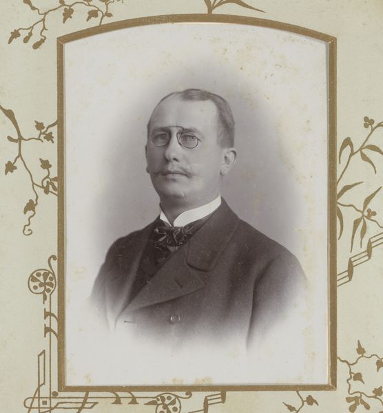 Curator: This is a portrait photograph from the Pach Brothers studio, likely taken in the late 19th century, possibly depicting Francis Sterne Palmer, a Harvard graduate from 1887. Editor: There's a formality, a certain self-awareness, in his gaze that strikes me. The pince-nez especially – they add such a layer of intellectualism, almost a caricature of the era's academic elite. Curator: Absolutely. Portraiture like this became increasingly accessible at the time, solidifying the image of institutions like Harvard and their role in shaping social identity. The photographic studios themselves became social institutions. Editor: The moustache, too, is interesting. It's such a specific style, a cultural marker of masculinity and perhaps even a certain social aspiration during that period. Curator: Precisely! It's a visual language of status and belonging, deeply tied to the cultural expectations of the time. The photograph becomes a document of these social codes. Editor: The fading sepia tones add another layer of meaning. It evokes a sense of nostalgia and highlights how visual symbols are carriers of cultural memory. Curator: Indeed, it reminds us of the power of these images to shape how we understand history and social structures. Editor: A fascinating snapshot of an era meticulously constructing its own image.