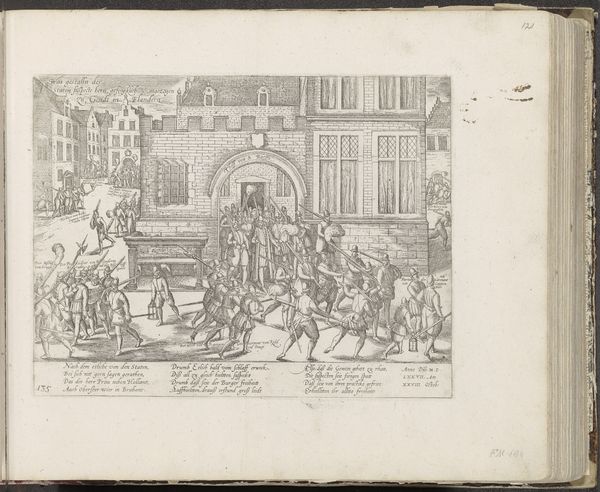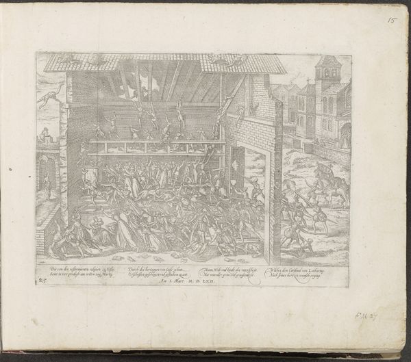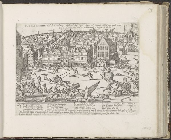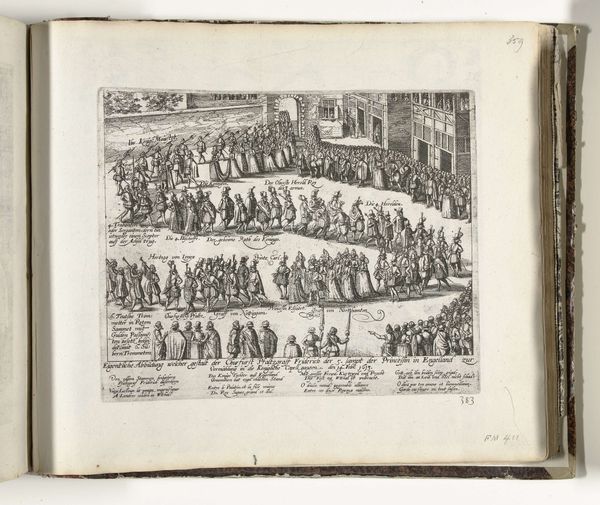Editor: Here we have "De kermiskraam van de actiehandelaars," or "The fair booth of the shareholders," an engraving from 1720. It depicts a chaotic scene filled with people. What strikes me is the energy; it's a frenzy of activity! What do you see in this print? Curator: The "frenzy," as you called it, captures the social and political atmosphere of the time quite well. This engraving, likely intended as a form of political commentary, needs to be viewed within the context of the economic bubbles of the early 18th century, especially those surrounding speculative investments like the Mississippi Company and the South Sea Company. The print becomes a visual critique of the speculative mania that gripped European society. Where do you think it's set, and what do you make of its various compositional layers? Editor: It looks like it's in a city, maybe Amsterdam or another major trading hub given the architecture. The layers seem to build up the chaos, with the crowd in the foreground, and something happening further away as well, what is that in the top background? Curator: Indeed, most likely Amsterdam. This visual stratification is deliberate, I think. In the background we see a depiction of some great collapse perhaps. The engraving stages a critical perspective on these market participants, their speculative endeavors, and, potentially, the instability they introduce to broader society. What public role do you think such prints served? Editor: Well, given that they're prints, it implies they were relatively accessible and reproducible. So maybe it served to disseminate a message to a broad public, fostering perhaps even outrage at the speculative excesses of the time. Curator: Precisely. The availability of prints allowed for rapid dissemination of visual commentary. Consider how engravings like these contributed to shaping public opinion. Looking at this artwork made me consider how art can be a vehicle to create narratives about public sentiment during times of crisis, and I'm glad we examined how those prints circulated at the time. Editor: Me too! It’s fascinating how a single image can contain so much information about its historical context.