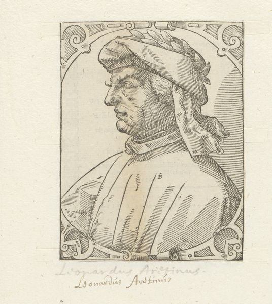 Editor: So, this is "Portret van Francesco Petrarca," made sometime between 1549 and 1577. It’s an engraving. The detail is striking, especially in the face, but it's also quite austere. What symbolic layers might we be missing in this portrait? Curator: A superb question. Note how Petrarch is depicted with a laurel wreath, an emblem of poetic and scholarly achievement tracing back to ancient Greece. This isn't just a portrait; it's an assertion of Petrarch’s status as a towering figure within the humanist movement, a direct connection to the intellectual lineage they aimed to revive. Does the engraving medium itself speak to that at all? Editor: It does! Engravings allowed for wider dissemination of images and ideas. This suggests they wanted Petrarch’s image to be easily accessible and spread far and wide, reinforcing his intellectual authority, right? Curator: Precisely! It’s fascinating how printmaking allowed them to propagate specific cultural memories, solidifying Petrarch's iconic status. Think about how he reshaped the sonnet form. In this portrait, can you see a visual echo of his refined poetic style? Editor: I think so. There's a precision and elegance in the linework that feels similar to the precision and elegance in his verses. Almost like the artist is drawing a parallel between Petrarch's face and his sonnets, immortalizing both in the process. Curator: Exactly. He becomes more than just a man; he's a cultural touchstone, replicated and distributed, an archetype. This small print encapsulates a massive shift in cultural identity. What strikes you most about his face? Editor: The gaze is so averted and introspective! And, how through widespread circulation, the engraving would have become almost like a modern-day meme, instantly recognizable? Curator: Absolutely. This exercise allows us to perceive the enduring impact and deliberate intention behind image creation. Editor: Thanks, I’m thinking about this portrait totally differently now. I see how a simple engraving can function as such a powerful symbol.