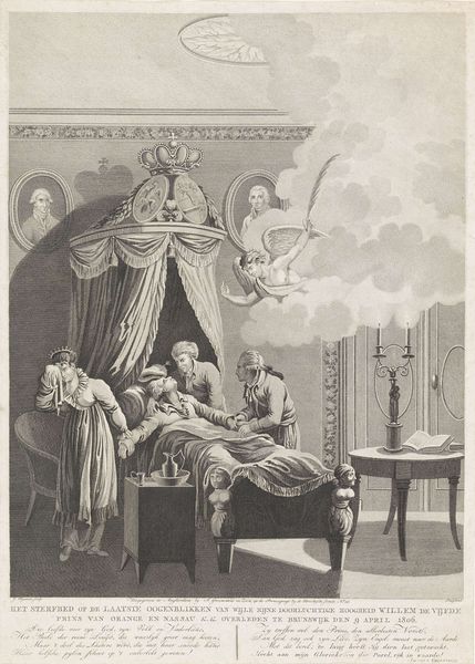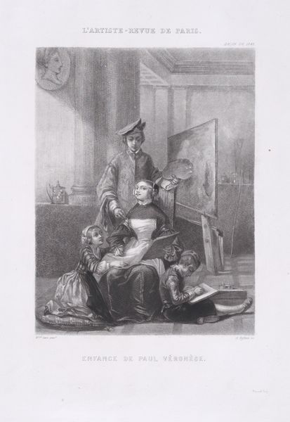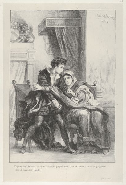 Editor: This is "Ce matin avant l'aurore...", or "This Morning Before Dawn..." by Honoré Daumier, a lithograph from around the 19th century. The soft, sketch-like lines create a really intimate atmosphere. What cultural symbols are at play in this image? Curator: This work speaks volumes about the evolving roles and expectations within 19th-century bourgeois marriage. Observe the garland of flowers upon the wife’s head, in contrast to the open book displaying crude eyes staring forward. Are these perhaps commentary on idealized domesticity versus perceived marital constraint, the wife celebrated for all but actual romance? Editor: I hadn't noticed the floral garland or the crude illustrations in the book. Are you suggesting these conflicting visual cues tell a deeper story? Curator: Exactly! The images evoke contrasting worlds—one of feminine innocence, the other suggesting a harsher reality perhaps hinting at infidelity and voyeurism. It prompts us to ask: What were the unspoken expectations, and the often-ignored frustrations, within marriage at the time? The open book almost hides as a tool to justify behavior while undermining an antiquated marital paradigm. Editor: So Daumier isn't just showing us a scene, but critiquing the power dynamics using symbolic objects. Curator: Precisely. Think about the recurring visual of “eyes” that proliferate through art. This visual speaks to larger sociopolitical realities of how “men look at women,” as analyzed by Berger. These symbols weave a tapestry of both conscious and unconscious social messages. How do you now react to the image as a whole? Editor: I see the scene differently now, understanding its layers of social commentary through symbols. Thanks for clarifying how the symbolic significance transforms how we understand it. Curator: Indeed! That's the beautiful thing about art: peeling back layers to reveal the cultural memory embedded within.