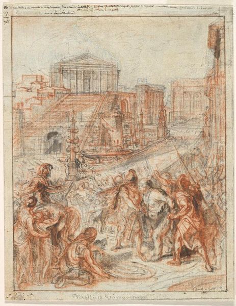 Curator: This drawing, rendered in the style of J.M.W. Turner, captures a distant cityscape from the vantage point of an ornate balustrade. Editor: There's something about the muted tones that makes the city feel like a memory, half-faded, half-real. Almost dreamlike. Curator: The balustrade, with its classical motifs and draped foliage, acts as a foreground that frames the urban panorama. It's almost theatrical, this sense of viewing a stage. Editor: It makes me think of the symbols inherent in architectural perspectives, how a city built of domes and spires represents both earthly power and spiritual aspiration. Curator: The sketchiness adds to its allure—details suggested rather than defined. And the way the light seems to dissolve forms, I am completely transported to a distant place and time. Editor: It’s intriguing how the architecture seems to both dominate and harmonize with the landscape, a negotiation of humanity and nature. Curator: Right, a conversation in lines. I keep thinking this drawing invites us to imagine the stories unfolding within that distant metropolis.