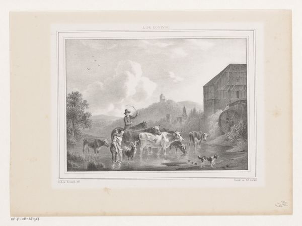 Curator: Ah, a nocturnal journey unfolds before us in this intriguing engraving. Johann Georg Schinz created it in 1822, titling it "Coach Pulled by Four Mules: Night Scene". It's an interesting window into a time gone by, don't you think? Editor: It definitely feels like a glimpse into another world, yes. My first thought is how dramatically lit it is, almost theatrical. The coach emerges from the inky shadows as if spotlighted against this huge cloudy sky... Curator: The drama is heightened by that bright moonlight, absolutely! Schinz expertly uses light and shadow to evoke a real sense of atmosphere. And think about the setting, most likely somewhere in Europe during the Romantic era. These were times of revolutions and great social and political change and artists captured those sentiments.. Editor: Revolution is a good word, I feel some tension simmering just under the surface. The guards escorting the carriage look quite alert, and who is that sinister figure looming in the distant field on the left? The scale contrast between figures and this monument like scarecrow...is disorienting. What narrative do you suppose is unfolding? Curator: Precisely, the artist seems keen on conveying a grand adventure. Well, maybe not always grand for everyone; imagine those poor mules pulling a heavy coach over bumpy roads! Editor: You know, looking closer, I notice the amount of detail Schinz packed in is astounding, down to every cobblestone and wrinkle in the clothing! Yet, the overall mood remains dreamlike...a night ride through the imagination, maybe. Curator: Indeed. Schinz has crafted more than just a scene, he has woven a narrative. These landscape prints are often records of travels, souvenirs but also could act as mementos of significant personal moments. They represent more than just scenic depictions; they are stories etched in ink and paper, shared through public exhibition. Editor: I agree, its very subtle... it makes you want to step into the scene and invent their tales. Thanks, now I want to see what other secrets this artist keeps hidden. Curator: A shared sentiment entirely!