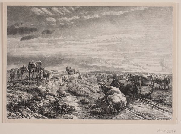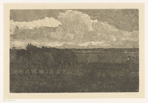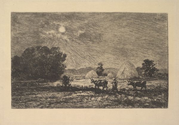 Curator: Looking at this work by Charles Jacque from 1864, called "The Morning," one immediately appreciates the intricate detail captured in this etching and print. It really draws you in. Editor: It does. It's a very somber scene; the monochromatic palette contributes to this feeling of muted labor, perhaps a bleak portrayal of rural life? Curator: Perhaps, but I see something more timeless in the representation of toil. The hunched figure on horseback evokes archetypes of the rural worker. Consider the symbol of the horse itself: throughout centuries, it has been the companion animal of farming communities. Editor: That reading strikes me as romanticized. These agricultural laborers were often working under oppressive social systems. I see exhaustion here, not timelessness, which certainly complicates the reading. Curator: But look at the precision of line, the way the artist captures the light of dawn breaking across the landscape. Does that luminosity not hold promise? Even hope? Editor: Hope perhaps for whom? Is it not the landed gentry who benefited from scenes such as these, and who often commissioned such works, not the other way around? Curator: Regardless of who the work may have been intended for, its artistic merit endures. Its appeal comes from the universal imagery that exists within; this visual record reminds us how connected we are, not only to this genre of pastoral scene, but to a sense of humanity which continues to reside, unchanged, throughout generations. Editor: I do recognize the technical skill at play, how it does create an image which could resonate widely, though not always with progressive meaning for its viewers across time. It's a window into the world that reflects back how differently people inhabit space, work, and perceive beauty depending on their positions and backgrounds. Curator: Indeed. Art allows us to confront perspectives. A scene may evoke very different memories and understanding for both the viewer, and also across multiple readings of the same symbols which were so familiar for the generations that created it. Editor: Absolutely. Considering these divergent perspectives hopefully broadens the historical narrative surrounding rural life and genre paintings, prompting reflection on historical and social contexts.