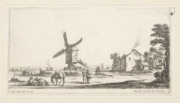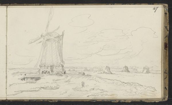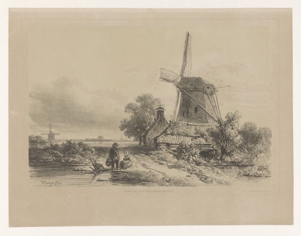 Maurits van der Valk created this landscape with ditch and mill using etching techniques. The composition is dominated by the windmill on the right, its structure rendered with careful detail. The strong verticality of the mill is set against the horizontality of the landscape, creating a dynamic tension within the image. The use of line is particularly striking; the etching captures the texture of the natural elements, from the clouds in the sky to the reeds in the foreground. This emphasis on texture and the contrast between light and shadow gives the landscape a tactile quality. The placement of the ditch acts as a visual pathway, leading the eye towards the horizon. The subtle gradations of tone, achieved through varying densities of etched lines, evoke a sense of depth. The artwork invites us to consider the relationship between the built environment and the natural world.