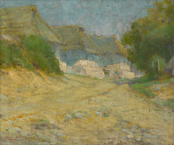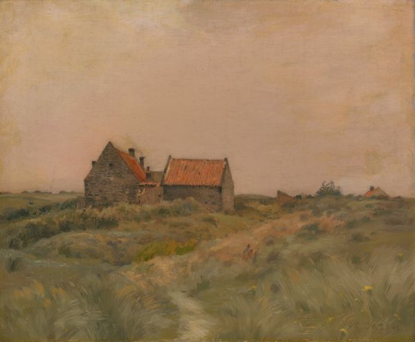 Editor: This is Alfred Sisley’s "Saint Mammès - Morning", painted in 1884. I’m struck by how the muted colors create such a serene, almost sleepy atmosphere. What draws your eye in this painting? Curator: I’m immediately drawn to the compositional arrangement – the way Sisley guides our eye with subtle visual cues and repeated use of the same colors. Note the placement of the buildings, balanced by the barges. It subtly invites us to contemplate the relationship between humanity and nature, a dialogue depicted through color and placement on the canvas. How does this implied dialogue resonate with you? Editor: I see what you mean about the dialogue. The houses seem almost to be watching the activity on the river. So you see symbolism in his specific compositional decisions? Curator: Indeed. The morning light itself is a symbol. Light often signifies enlightenment, a new beginning. Observe how Sisley uses it to bathe the entire scene in a soft, diffused glow. Does it feel welcoming, like a fresh start, or does something else strike you? Editor: It definitely feels welcoming. The light, mixed with the buildings and their red roofs reminds me of community, like it is home. But there is not very much of this 'red' coloring, I wonder if there is any significance? Curator: That contrast could represent something internal. Perhaps the tension between tradition and progress. Red is a bold color choice here - think fire, passion, even danger - these would juxtapose nicely to the other duller tones of the buildings, no? Now thinking that there are inhabitants, what symbols might reside in Sisley painting what one might perceive? Editor: Wow, I didn't even notice. Seeing this and contrasting what might exist in Sisley's head is very cool. It has given me a great starting point and things to consider while admiring this work. Thanks! Curator: My pleasure. This intersection of internal and external narratives makes interpreting paintings a journey, always more than a single destination.