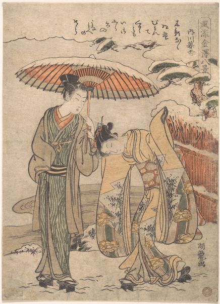 Curator: Kiyonaga's c. 1777 woodblock print, “A Fan Suggesting a Dispersed Storm” presents a scene that is both intimate and evocative. I find the domestic setting rendered in the Ukiyo-e style immediately captivating. What are your first impressions? Editor: Intimacy certainly resonates here. The composition feels meticulously planned, with strong verticals created by the lines of the women and fence which contrast nicely against the curve of the small child and bank above the small waterfall. But does the visual harmony not betray the purported dispersed storm? Curator: The "storm" isn't literal, I suspect. A fan can become a loaded object, suggesting a complex psychological drama, maybe one where interpersonal dynamics feel like tempests themselves. A seemingly tranquil scene hides tensions—the fan serves as a harbinger or symbolic veil. Editor: Perhaps. Visually, my attention is drawn to how the cascading waterfall juxtaposes with the stillness of the central female figure. The waterfall is a textural feast. The artist uses clear visual indicators to contrast movement and tranquility; a study of opposites co-existing, wouldn't you agree? Curator: Absolutely! Japanese aesthetics often intertwine tranquility with underlying dynamism, and it is right there in the pictorial symbolism. The waterfall, apart from being water, mirrors her own turbulent, interior emotions...a release... perhaps frustration. Remember, the Ukiyo-e style often served as a mirror of contemporary life, exploring desires, anxieties, and dreams. Editor: I also observe a restrained palette. The subdued tones— predominantly cool grays and blues — amplify the sense of calm. And how expertly Kiyonaga employs line— crisp and precise. It defines form but doesn't constrain it, a testament to the mastery inherent in woodblock printing as a process. Curator: Agreed. Even the lines of text are crucial. Though the meaning may escape modern viewers, in their own way, they tie this moment to something more timeless and resonant. Art speaks beyond words but words can guide. Editor: So while I entered perhaps resistant to the “dispersed storm,” I now can perceive it in the deliberate compositional juxtapositions. I still love the waterfall and line. Curator: That intersection between image and inner resonance, where a simple scene invokes emotional or even societal reflections... well, there's a beautiful mystery that connects this work to our shared human history.