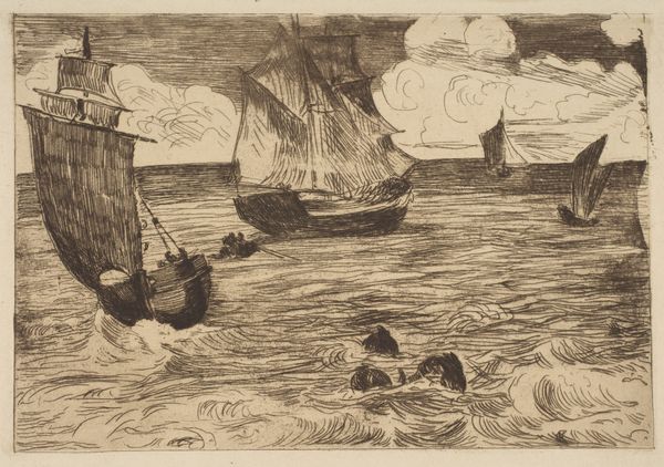 Albert Pinkham Ryder created "Under a Cloud," an oil painting now at the Metropolitan Museum of Art. The somber palette and rough application of paint across the canvas evoke a scene heavy with foreboding. Ryder's composition divides the canvas into zones of sky, cloud, sea and boat. The dark cloud looms over the horizon, mirrored by the shadowy sea below. A stark contrast is the small sail boat which cuts through the composition, its mast angled sharply to the left, creating a dynamic tension. This contrast underscores a semiotic reading: the cloud functions not just as a meteorological element but as a signifier of nature’s indifference. Ryder's strategic placement of the moon, a tiny point of light, serves to heighten the overall sense of the sublime. The visible brushstrokes and thick layering of paint underscore the materiality, reminding us of the physical act of painting and the artist’s emotional investment in the subject. As such, "Under a Cloud" is a dynamic expression of the artist's interiority made tangible through form.