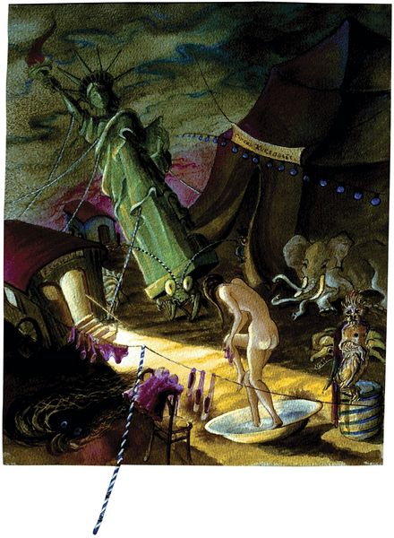 Lubo Kristek made this image, Pasiphaë Through the Eyes of the Modern Era and Average Sodomising Moment, using what looks like watercolours to make very controlled marks, but in a kind of unruly way that feels very human. The physicality of the paint is really interesting here: it's really thin in places, almost like a wash, but then there are these really dense areas, especially in the bull, which are almost opaque. The colors are quite muted, but there's still a real vibrancy to them, especially in the contrast between the bull and the woman. Look at the way the bull’s blackness contrasts with the pink underbelly. This is a work that embraces ambiguity and multiple interpretations. I’m reminded of some of Dali’s surrealist works. There’s a shared sense of the bizarre and the dreamlike. Ultimately, this piece reminds us that art is not about answers, but about asking better questions.